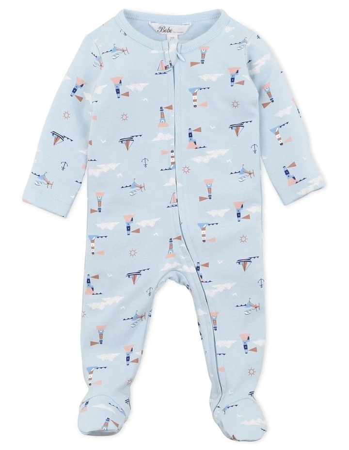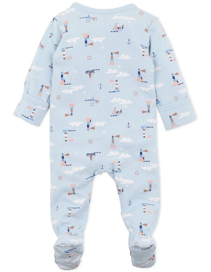 This long sleeve romper features a cute nautical lighthouse print, enclosed feet, inbuilt fold over cuff mittens and a zip front opening for ease of dressing.