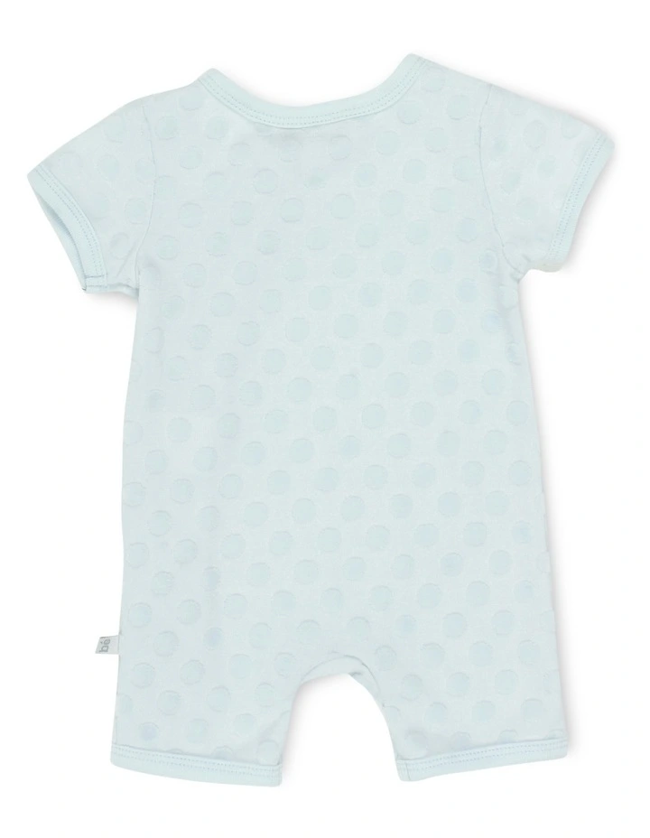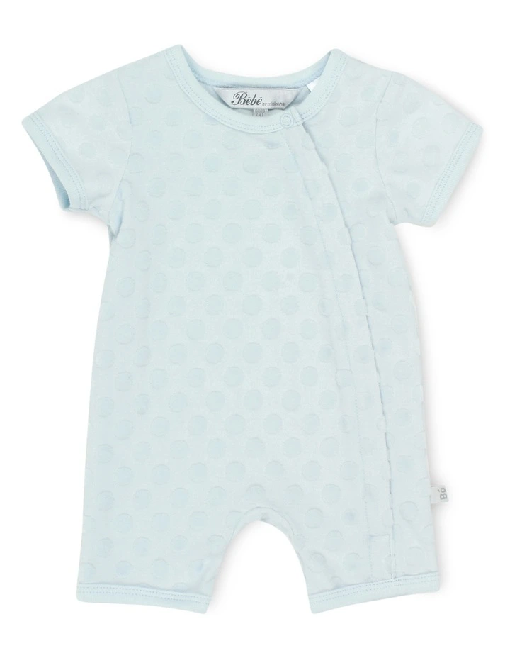 This unisex blue jacquard self spot romper has short sleeves and short legs, front side zip opening for ease of dressing while being soft and stylish for your little one.