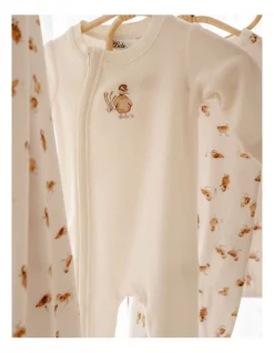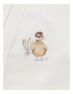 This long sleeve terry towelling romper features enclosed feet, sleeve cuffs, a zip front opening and a cute duckling graphic embroidered on the front.Β