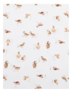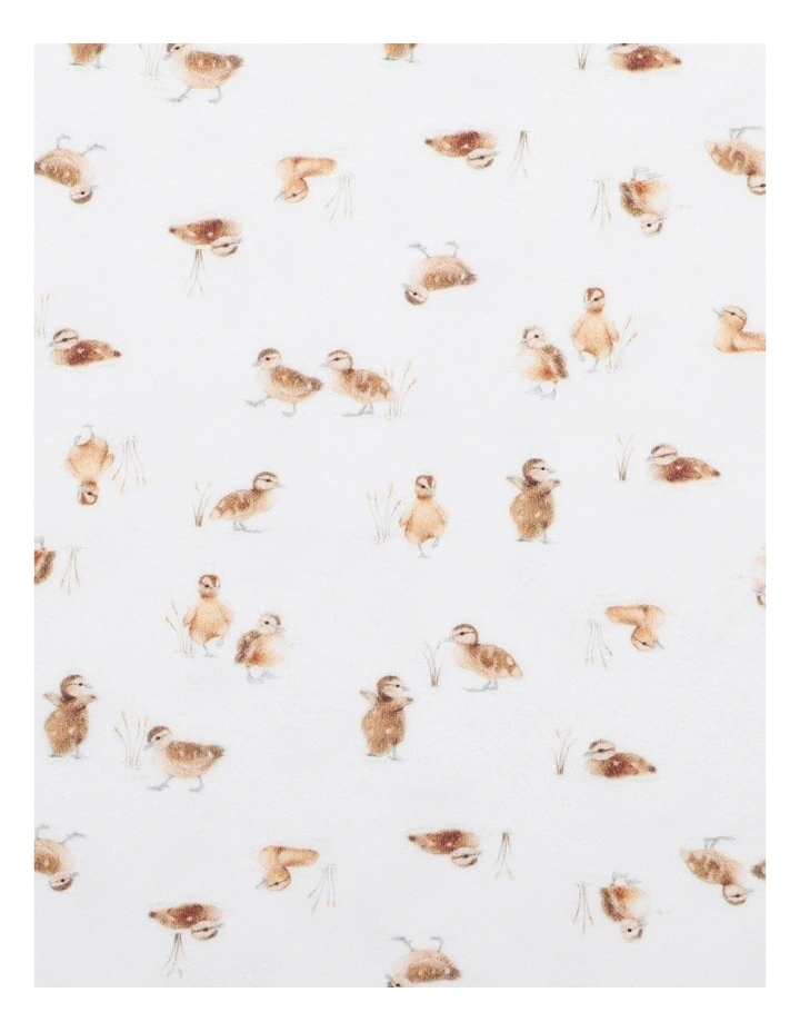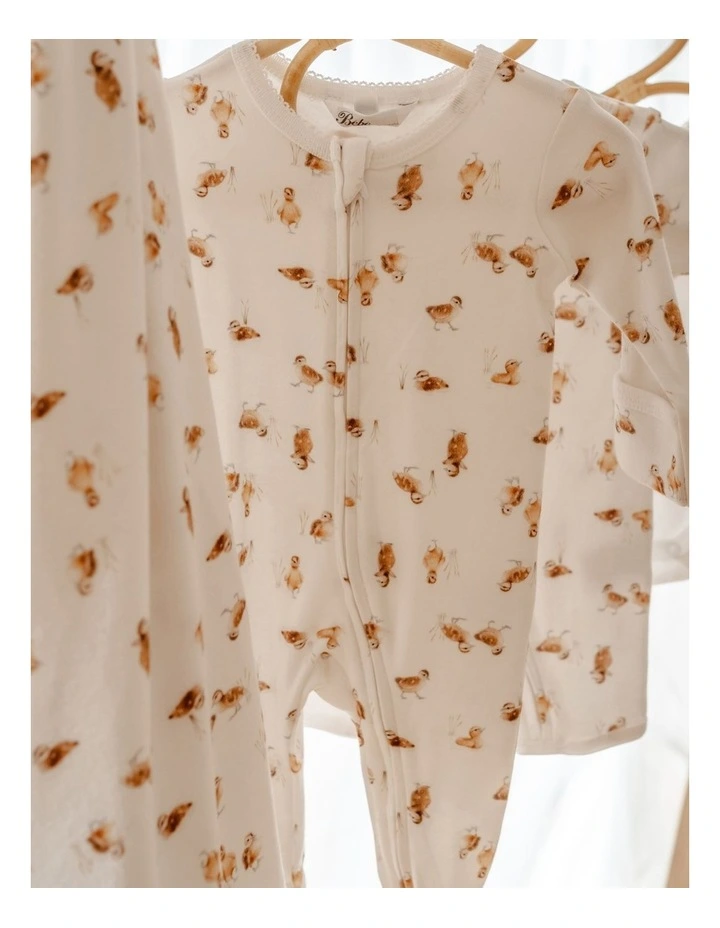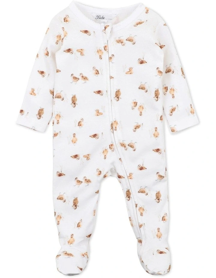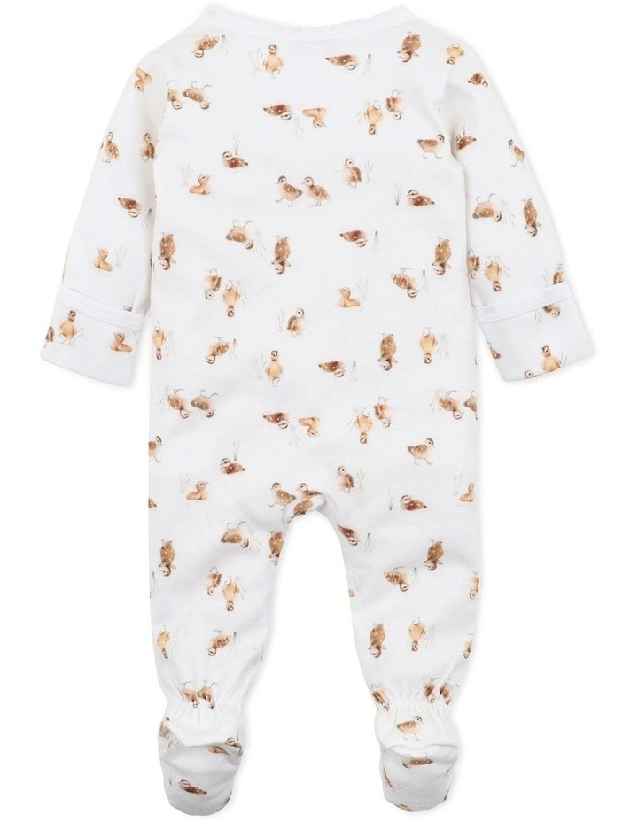 This long sleeve romper features a cute duckling print, enclosed feet, inbuilt fold over cuff mittens, contrast neck binding with picot trim and a zip front opening for ease of dressing.
