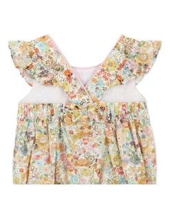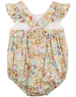 This sweet Liberty of London Classic Meadow print bodysuit romper features contrast piped waist and neck seam, frilled cross back straps, elasticated legs and a concealed press stud crotch opening for ease of dressing. Garment photographed in size 00 (3-6mth).
