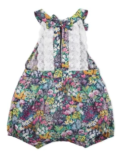 This beautiful Liberty of London Painters Meadow print playsuit features a lace back bodice with front and back bows, elastic waist and leg cuffs and a press stud crotch opening for ease of dressing. Garment photographed in size 00 (3-6mth).