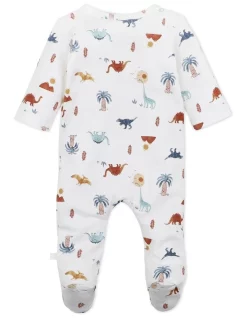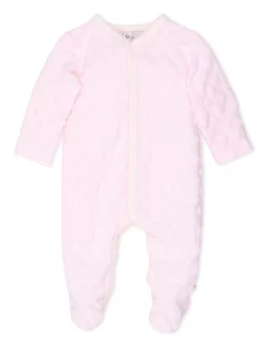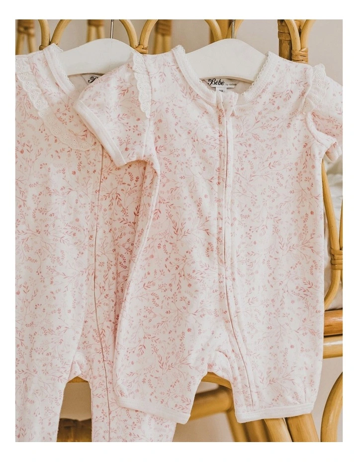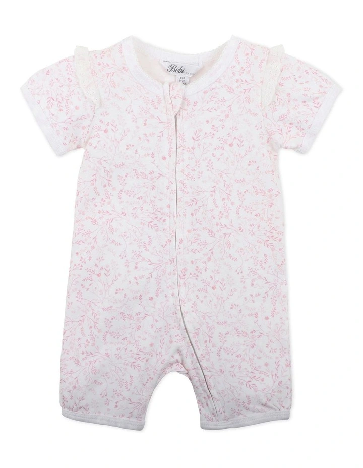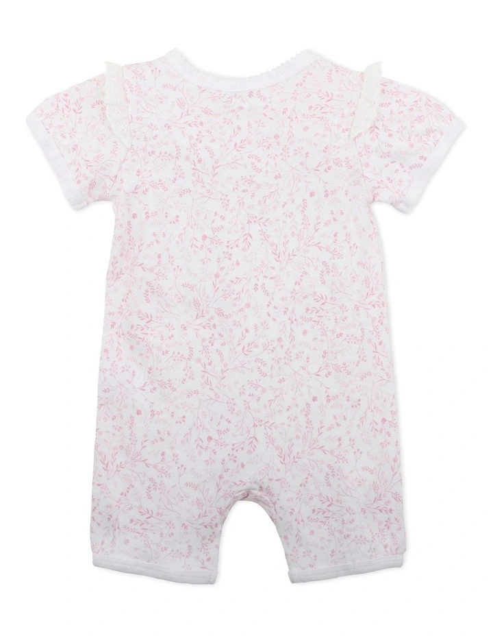 This short sleeve romper features a lovely fern print, broderie lace shoulder frills, contrast binding with picot neck trim and a zip front opening for ease of dressing.