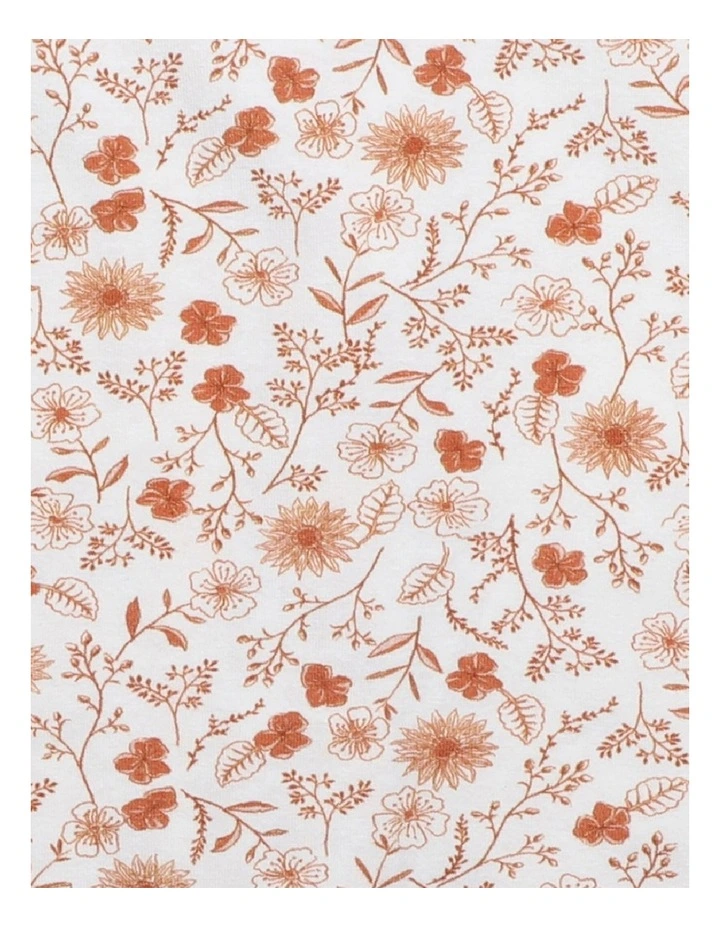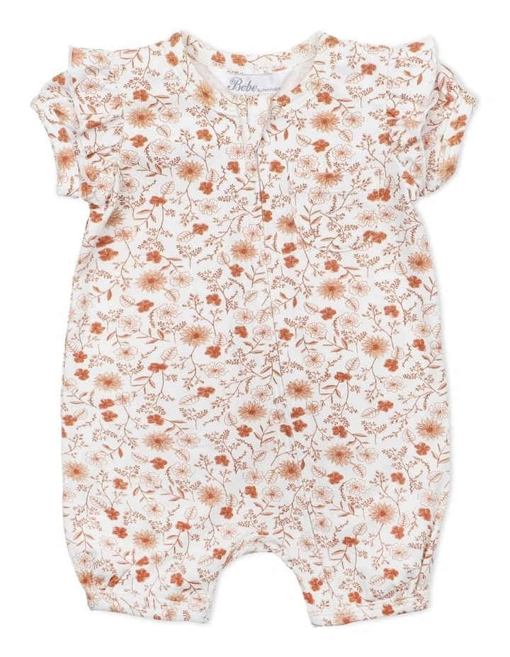 This short sleeve romper features a lovely tan monochromatic floral print, shoulder frills, a breast pocket and a zip front opening for ease of dressing.