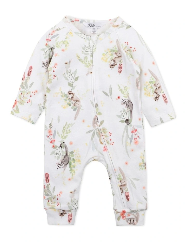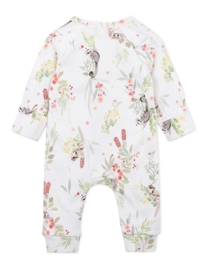 This lovely long sleeve, long leg romper in a sweet native floral and possum print features inbuilt fold over cuff mittens, and a front zip for ease of dressing your little one.