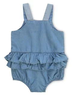 Cotton modal jersey strappy short romper, elasticated waist, strippe pattern, branded plate.