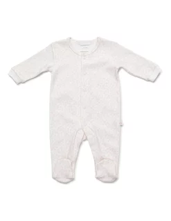This two-pack of long sleeved and footed studsuits is ideal for your baby’s wardrobe. One is in pink and white stripes and one is in pink spots on white. The studsuits have front and leg openings with press-studs