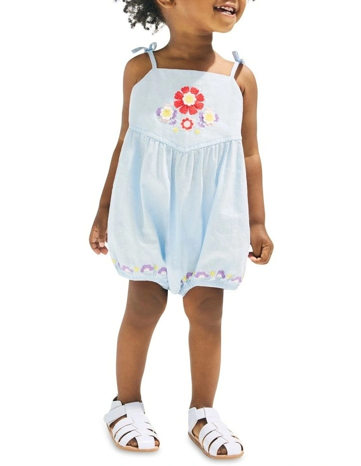 This adorable romper is a summer essential for your little one. Crafted from a lightweight cotton linen blend, it ties at the shoulder and features floral embroidery.