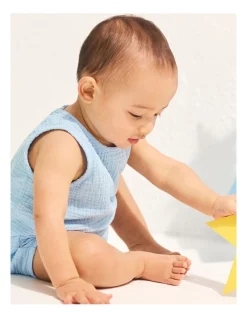 Crafted from 100% premium cotton, this romper features two patch pockets and flat seams for a neat look. Featuring a button down rear and a round neckline, the sleeveless design ensures a comfortable fit for your little one.