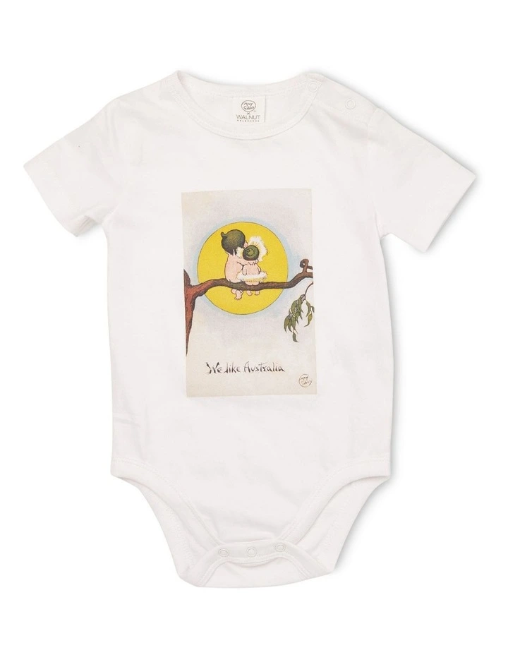 Features: May Gibbs all over print. Snap closures at crotch and neck. Fitted body. Short sleeve.