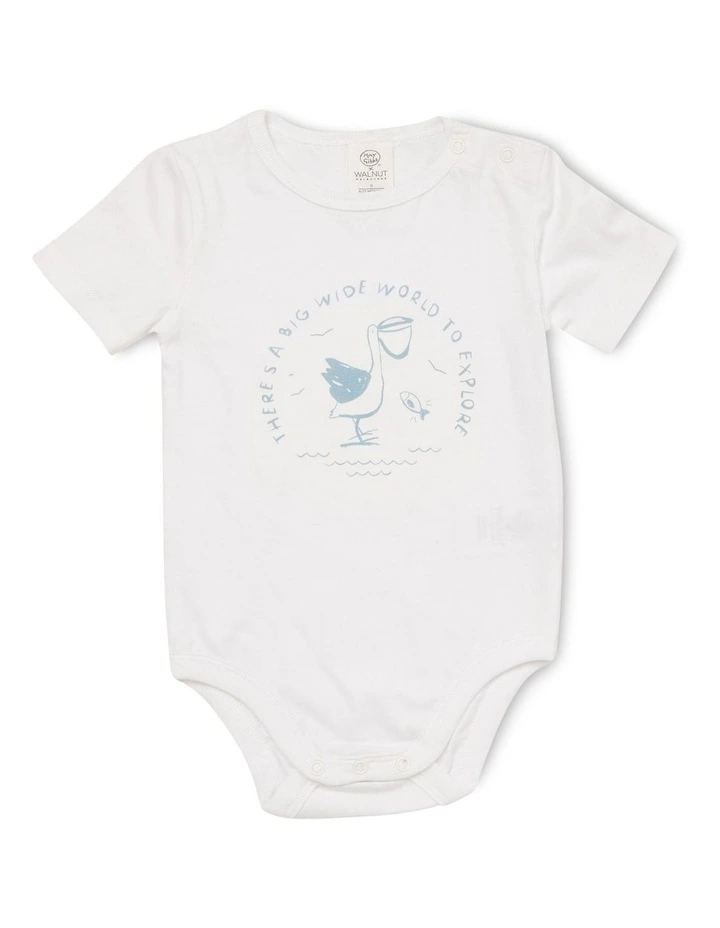 With short sleeves and snaps at neck and crotch for quick and easy nappy changes, the Sparrow Onesie is the perfect one piece that allows your little one to keep comfy all day long during the warmer months. In the Pelican placement this onesie is perfect for gifting or for your very own mini.