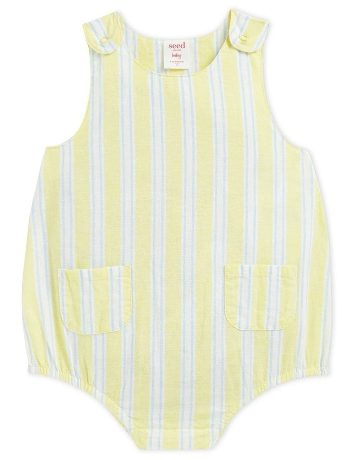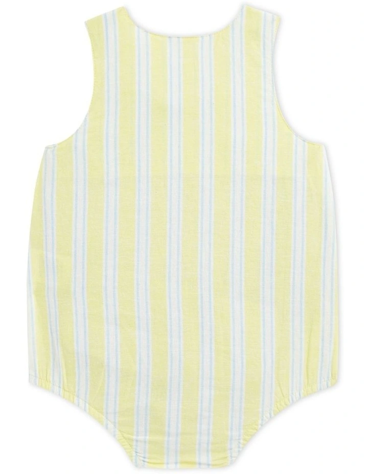 Covered all over in an all-over stripey print, this romper is crafted from a lightweight linen blend. Designed with snap fastenings at the gusset and bib front fastenings for easy changes, this romper is decorated with two front patch pockets and has elasticated leg openings for the perfect, comfortable fit.