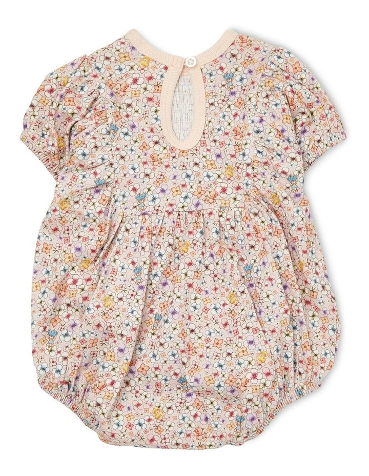 Features: May Gibbs all over print. Smocking and ruffle detail. Peasant sleeve. Elasticized leg openings. Snap buttons at crotch.